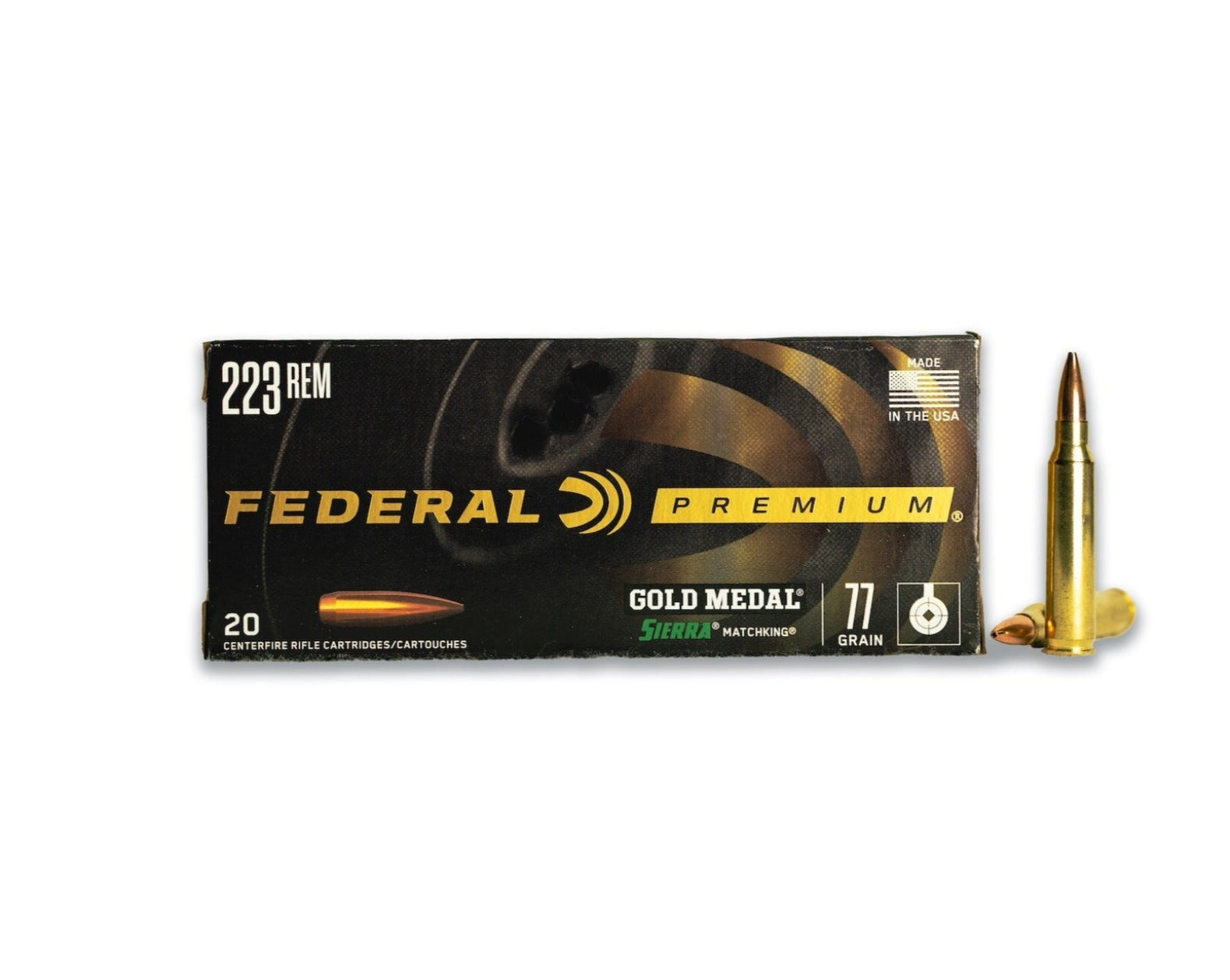 223 REM 77GR Federal Gold Medal Match Sierra Matchking BTHP (GM223M3) combines the Sierra MatchKing Boat-tail bullet with Federal's proprietary delivery system and stringent manufacturing controls, giving you what many expert shooters consider the most accurate match round available from a factory. Military, Law Enforcement and world-class competitors choose Gold Medal when it counts the most.