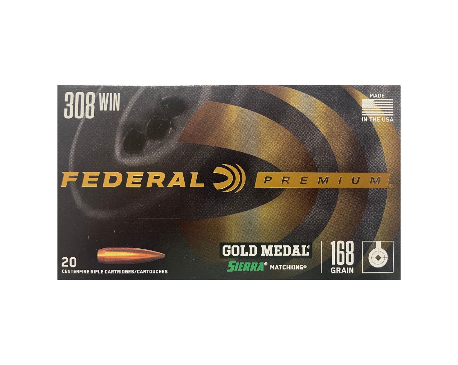 308 (7.62x51) 168GR Federal Gold Medal Match Sierra Matchking BTHP (GM308M) combines the Sierra MatchKing Boat-tail bullet with Federal's proprietary delivery system and stringent manufacturing controls, giving you, what many expert shooters consider, the most accurate match round available from a factory. Military, Law Enforcement and world-class competitors choose Gold Medal when it counts the most.