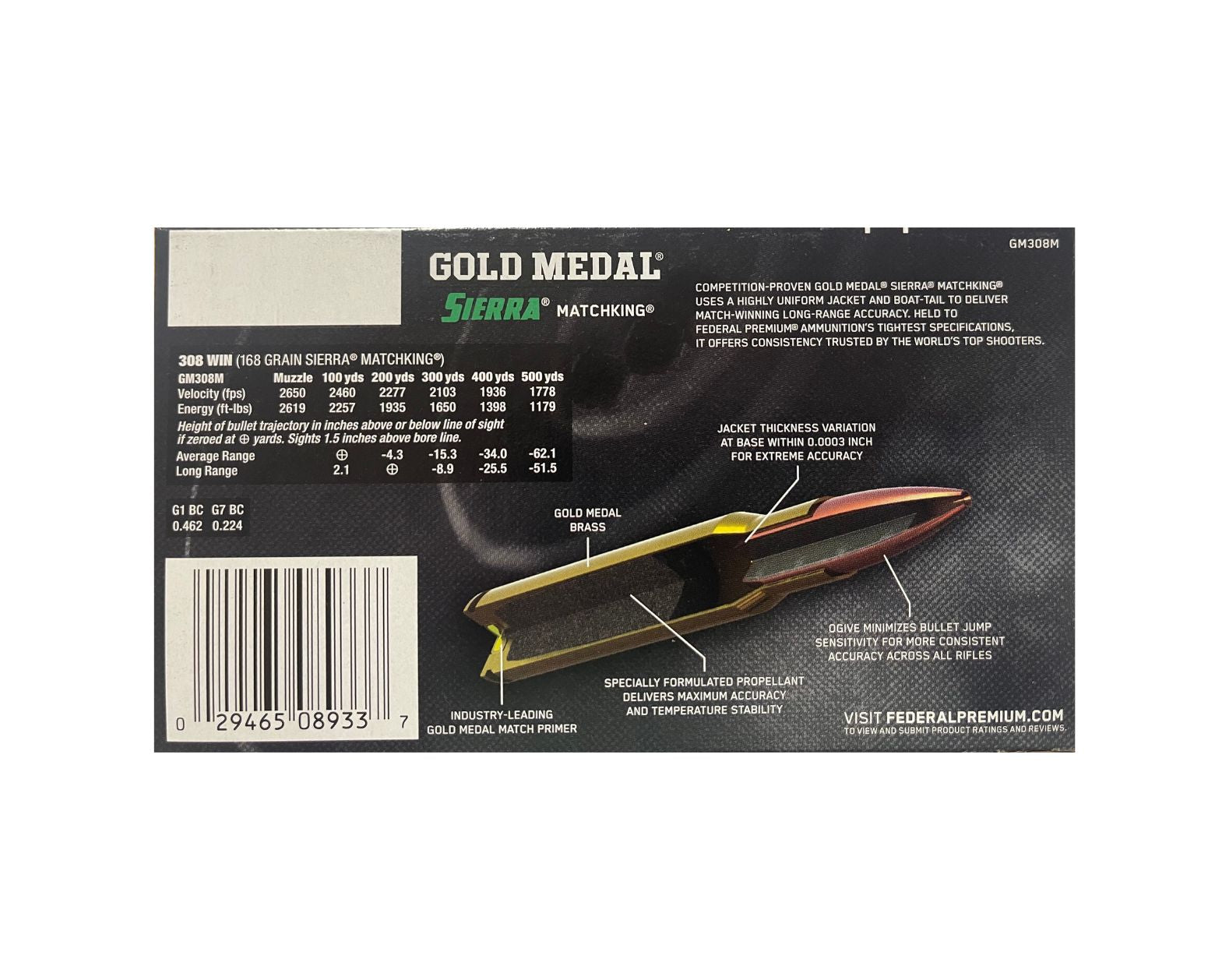 308 (7.62x51) 168GR Federal Gold Medal Match Sierra Matchking BTHP (GM308M)